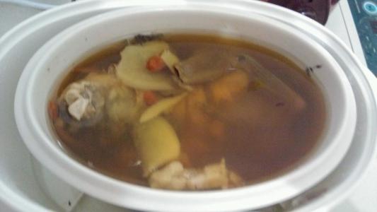 柴鸡或乌鸡1/2只,姜5片,中药:当归10克、党参30克、黄茂30克、枸杞子15克,红枣3颗,盐适量。把把中药洗净;鸡肉清洗干净后切块,过沸水去血沫捞出;煲汤锅加清水,放入鸡块、姜片、红枣和中药(枸杞子最后再放),大火烧开转小火慢炖3~4小时,然后再加入枸杞子和盐,再炖15分钟即可。温馨提示:因产妇月子期间不能吃花椒、大料, 胃消化功能也比较弱,所以炖汤肘肉炖得越烂越好,不仅内会更香,汤也更鲜美,而且营养都在汤里。